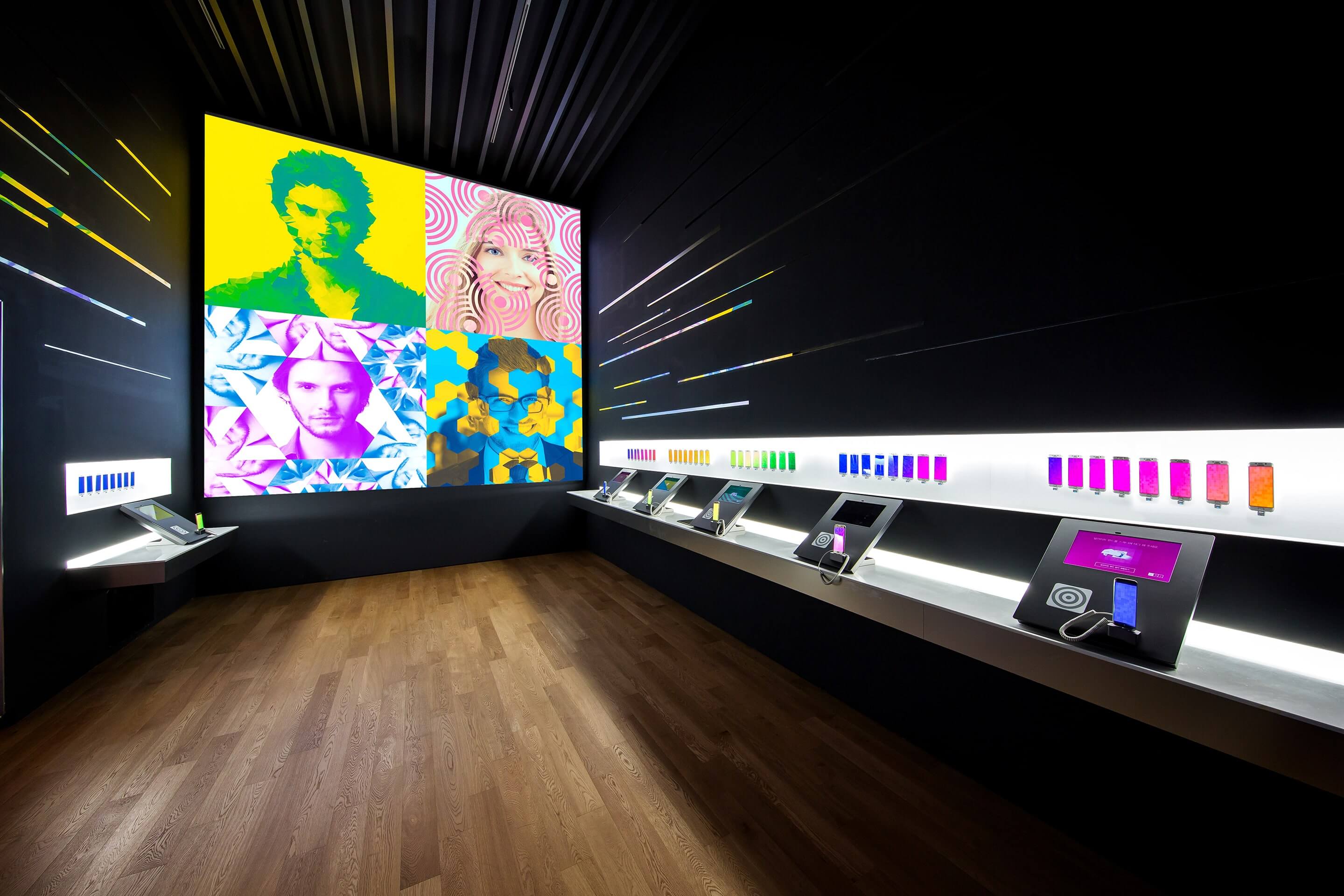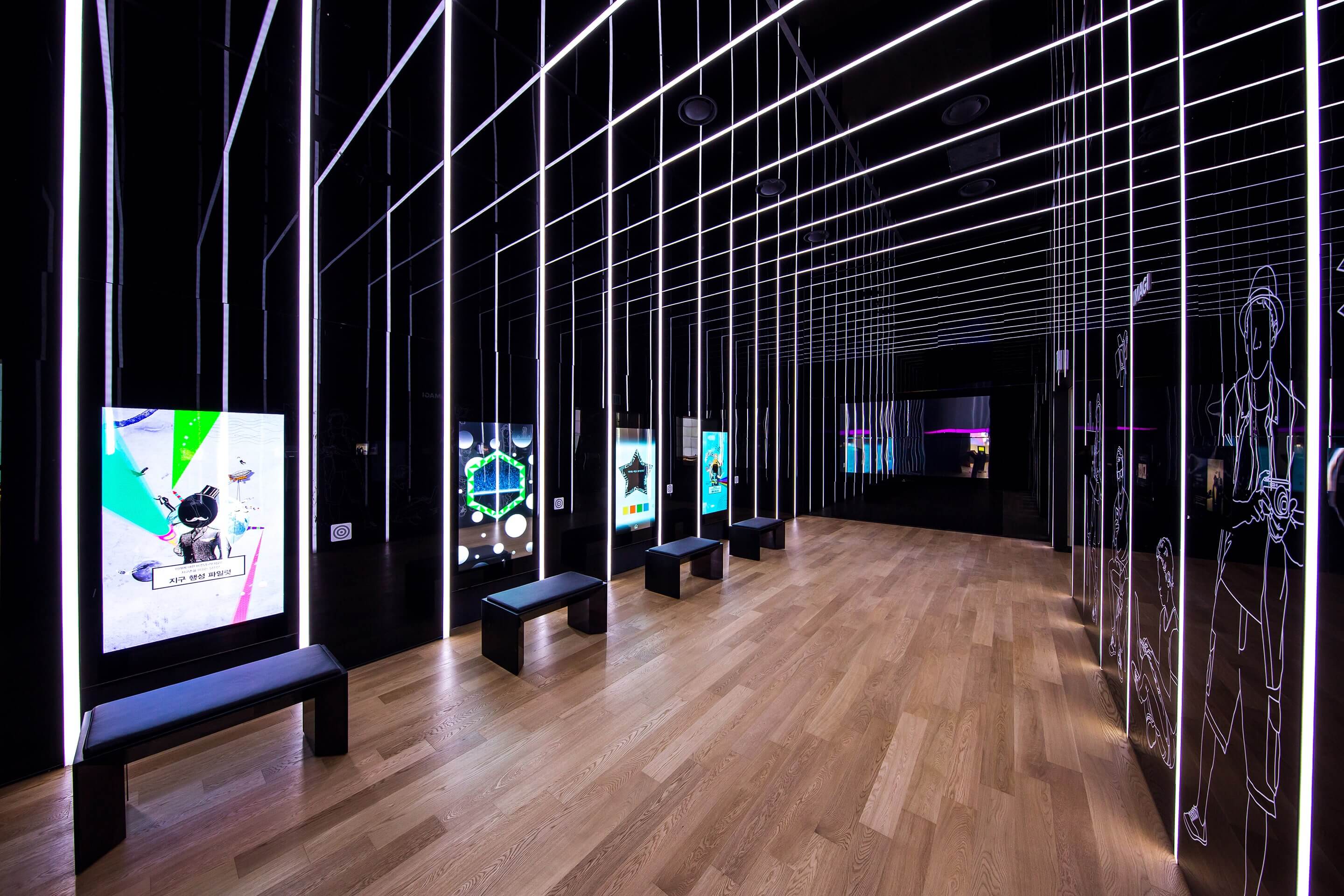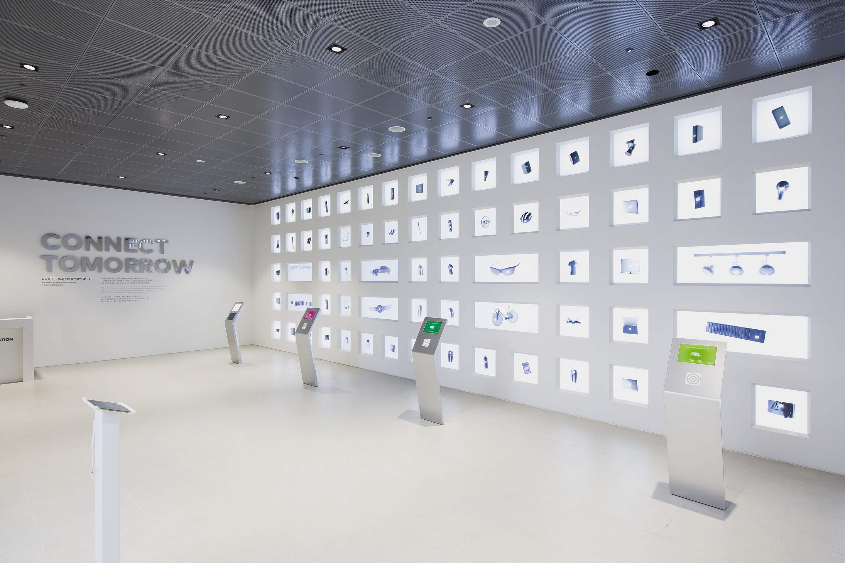 Samsung d’light is an interaction based showroom in Seoul’s pulsating Gangnam district. For the recent renovation of the space we came up with digital experiences and a spatial design concept which allows for visitors to get in touch with Samsung solutions. Multiple rooms and areas feature specific products and related interactions on two floors. The spacious lobby offers the modularity to not only display products, but also host events and workshops. The whole exhibit is connected to a retail store in the basement of the building.