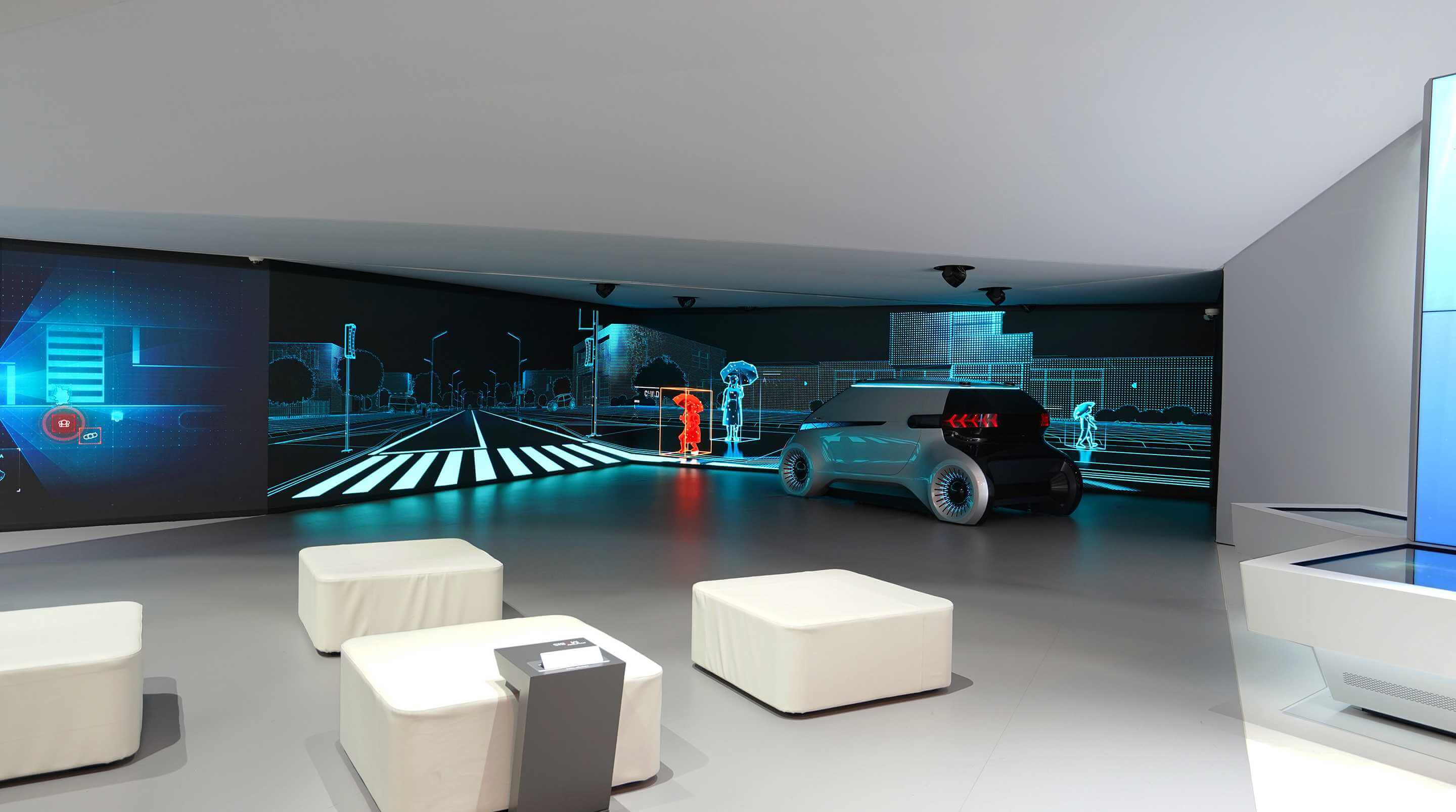 We used the principle of unveiling a stage in a new way – forming a bold and dynamic shape through a vertical surface bending upward, opening the booth in transverse direction towards the visitor flow. Providing a straightforward organization of the booth, we created space for an immersive multimedia experience of the new headlight technologies. Architecture aligned the media screens in space for an environment that unified the concept car and media content. By simulating traffic situations synced to the movement of the concept car, visitors experienced a dynamic presentation of Hyundai Mobis‘ technology.